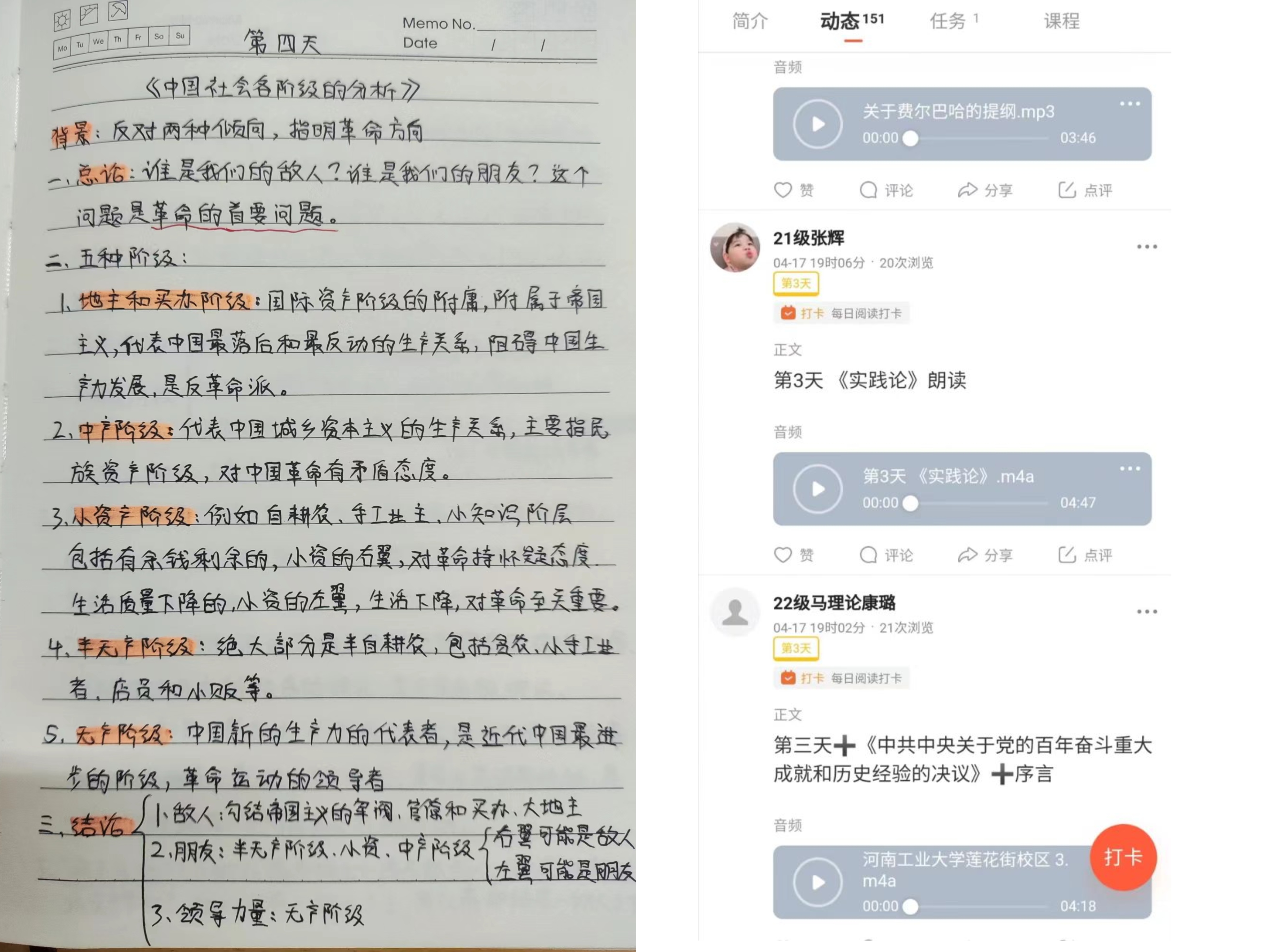 研读打卡活动受到了同学们的积极响应和广泛参与,大家纷纷以读书笔记、原著朗诵等方式记录自己的阅读过程。《共产党宣言》、《资本论》、《毛泽东选集》、《自然辩证法》等经典著作均在同学们的阅读之列。