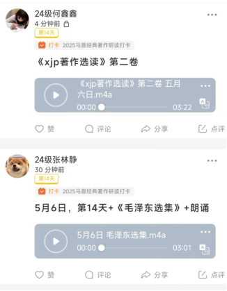 于4月23日,启动了“经典润心·真理铸魂——品读马列经典,感悟思想伟力” 马克思主义经典著作研读打卡活动,学院全体硕士研究生参与其中。