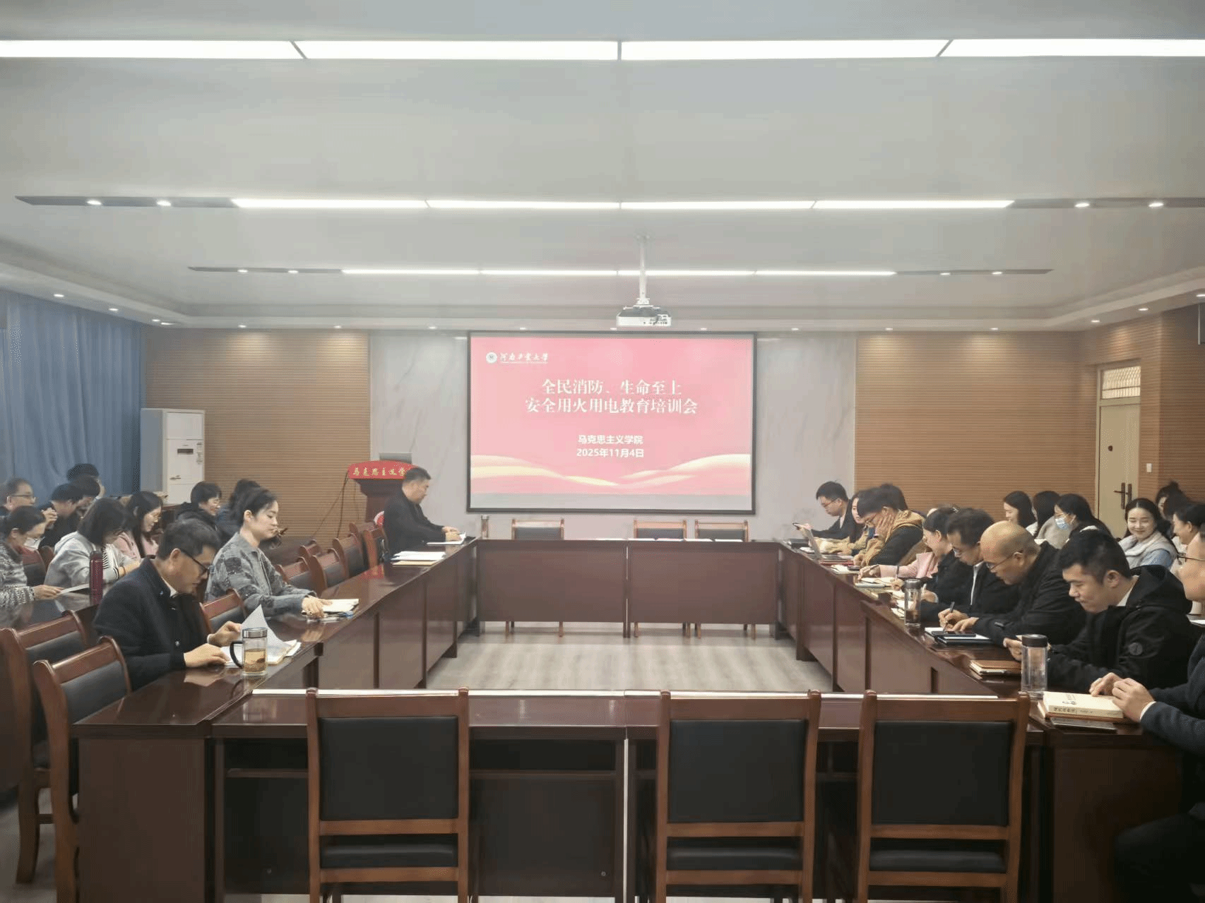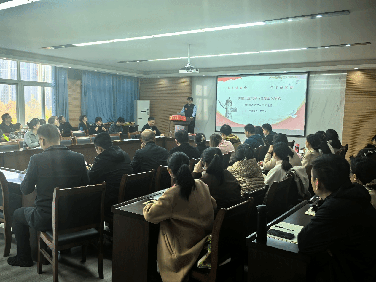 联合河南省安居防火宣传中心于3511会议室开展消防安全知识讲座,全体教职工和学院研究生代表参加,河南省安居防火宣传中心教员贺奕岚主讲。