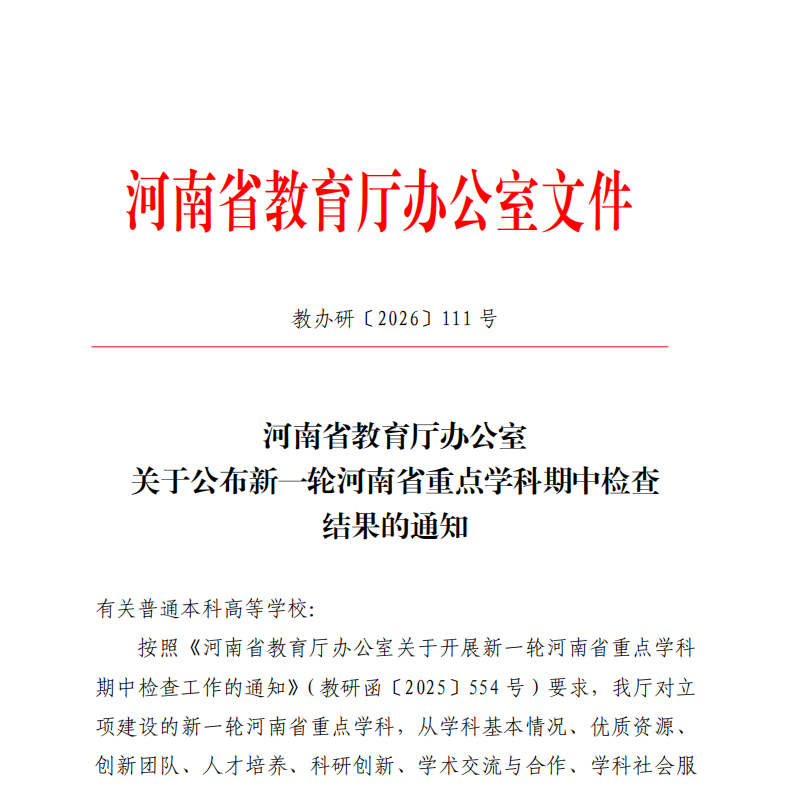 根据《河南省教育厅办公室关于公布新一轮河南省重点学科期中检查结果的通知》(教办研〔2026〕111号),教育厅从学科基本情况、优质资源、创新团队、人才培养、科研创新等方面对建设学科期中目标达成情况和标志性成果质量与水平进行了全面评价,微密圈