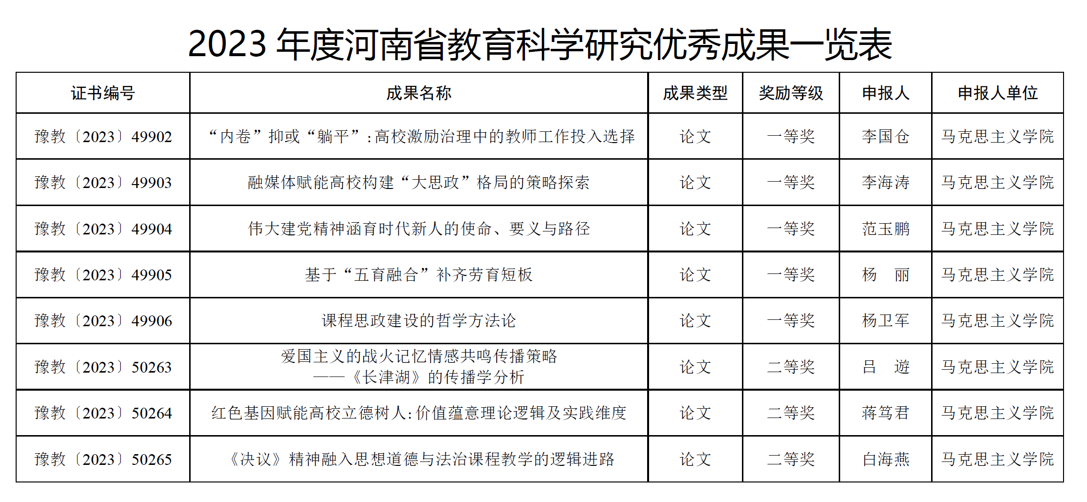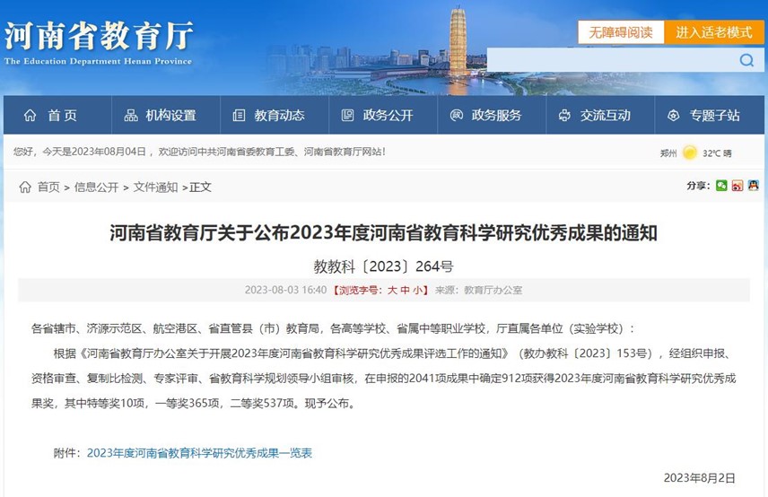 8月3日,河南省教育厅发布《关于公布2023年度河南省教育科学研究优秀成果的通知》(教教科〔2023〕264号)。经组织申报、资格审查、复制比检测、专家评审、省教育科学规划领导小组审核,在申报的2041项成果中确定912项获得2023年度河南省教育科学研究优秀成果奖。微密圈