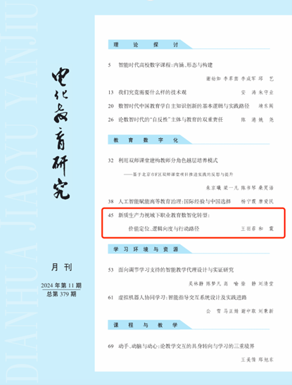 青年教师王羽菲在《电化教育研究》2024年第11期发表理论文章《新质生产力视域下职业教育数智化转型:价值定位、逻辑向度与行动路径》,这是微密圈