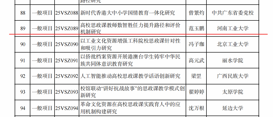 副教授范玉鹏申报的课题《高校思政课教师数智胜任力提升路径和评价机制研究》(项目编号:25VSZ089)成功获批立项,实现国家社科基金高校思想政治理论课研究专项连续三年不断线。