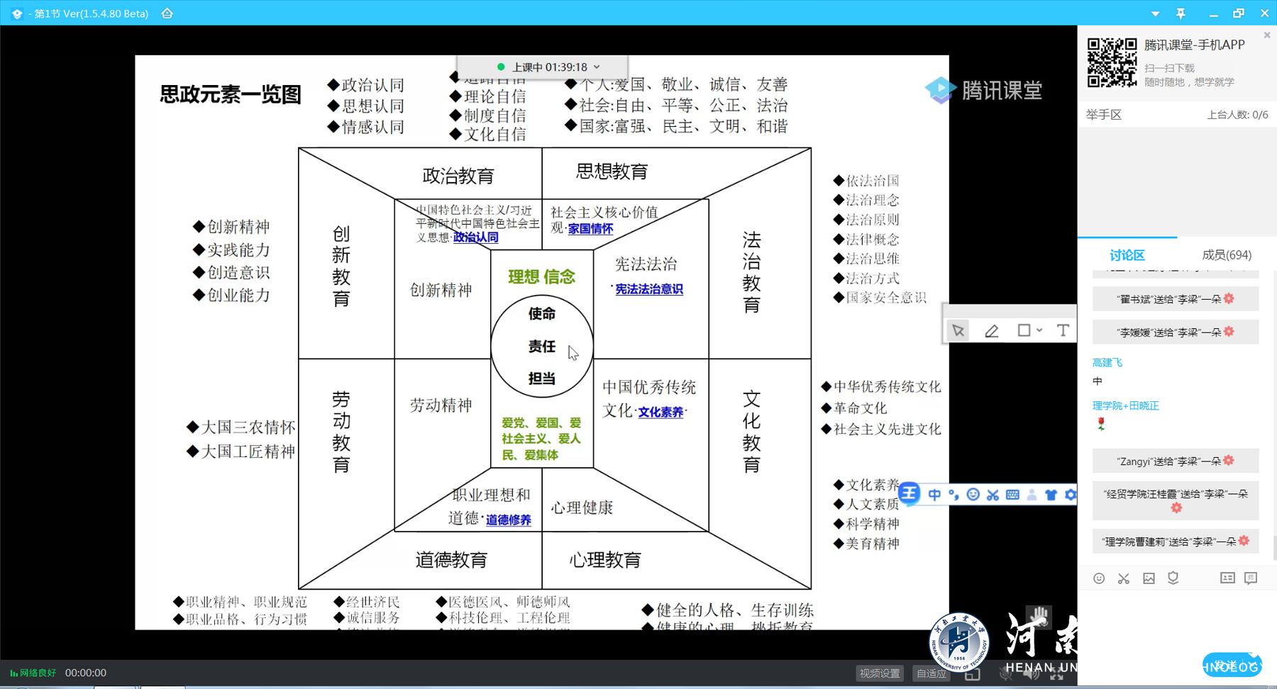 为全面落实立德树人根本任务,切实提高课堂教学的育人水平,10月5日晚上7点,学校邀请上海交通大学李梁教授在腾讯课堂平台开展全面推进课程思政建设培训。学校副校长郭长华、党委副书记李学雷,各学院党政领导,各教学单位任课教师,学校教学督导委员会委员,党委宣传部、教务处、研究生院、教师发展中心、学生处、团委、信息化管理中心等相关部门人员1000多人参加视频培训会。教务处处长杨六栓主持会议。